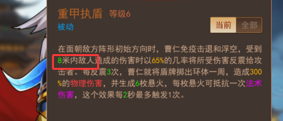 比如貂蝉的技能【抚风回袂】中出现了“周围4米”和“击退1米”;曹仁技能【重甲执盾】提到对8米内敌人攻击反震。