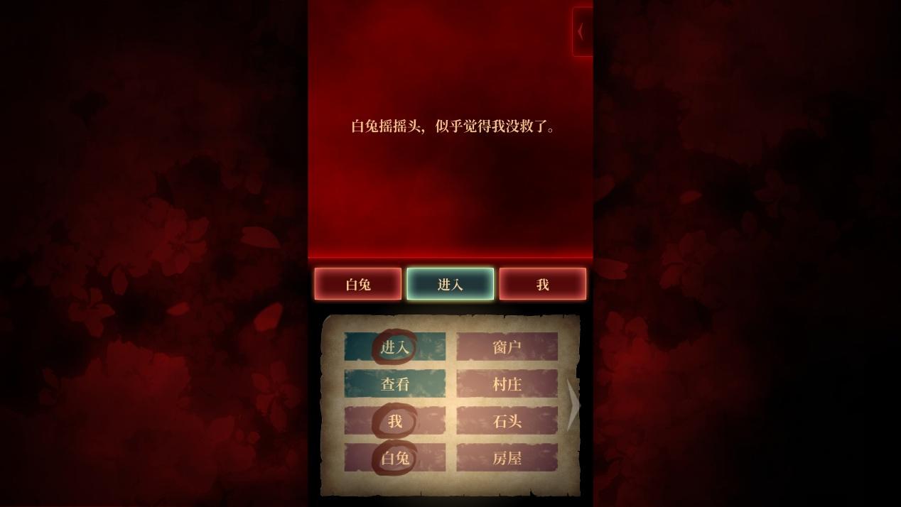 虽然看起来有点难度,但这种亲自解谜的体验还是蛮有代入感的,在设计上也让人耳目一新。这种文字谜题替代了传统的分镜演出,同时也为玩家带来了更多的选择自由度,只需要多次尝试不同的组合,就可以发现过关的提示,甚至是彩蛋。就比如“白兔+劈砍+木门”这样的奇怪组合就会引发不同的事件,但如果“不小心”拼出“我+插入+白兔”这类糟糕的词语,那就免不了被疯狂吐槽了。