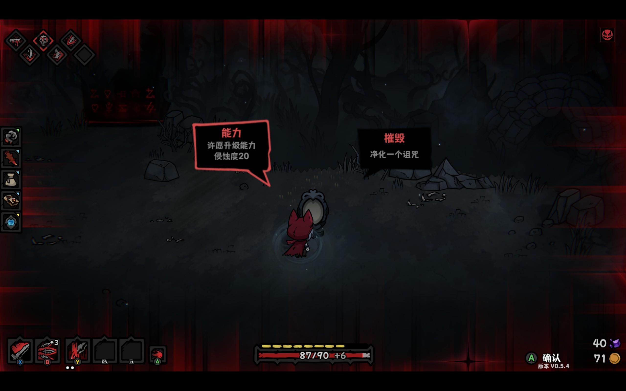 前期一般选择被动,遗物除非运气好,不然都是低品质的,很不推荐去宝箱房,不过选择被动会带来一定的诅咒值,有利有弊吧(可弊呢,可弊坠机了),其次,就是主动技能,只有三个槽位,每个技能都能升级三次,玩了几个小时下来,感觉升级强度并不会很明显,远远不如获取一个全新被动的收益。