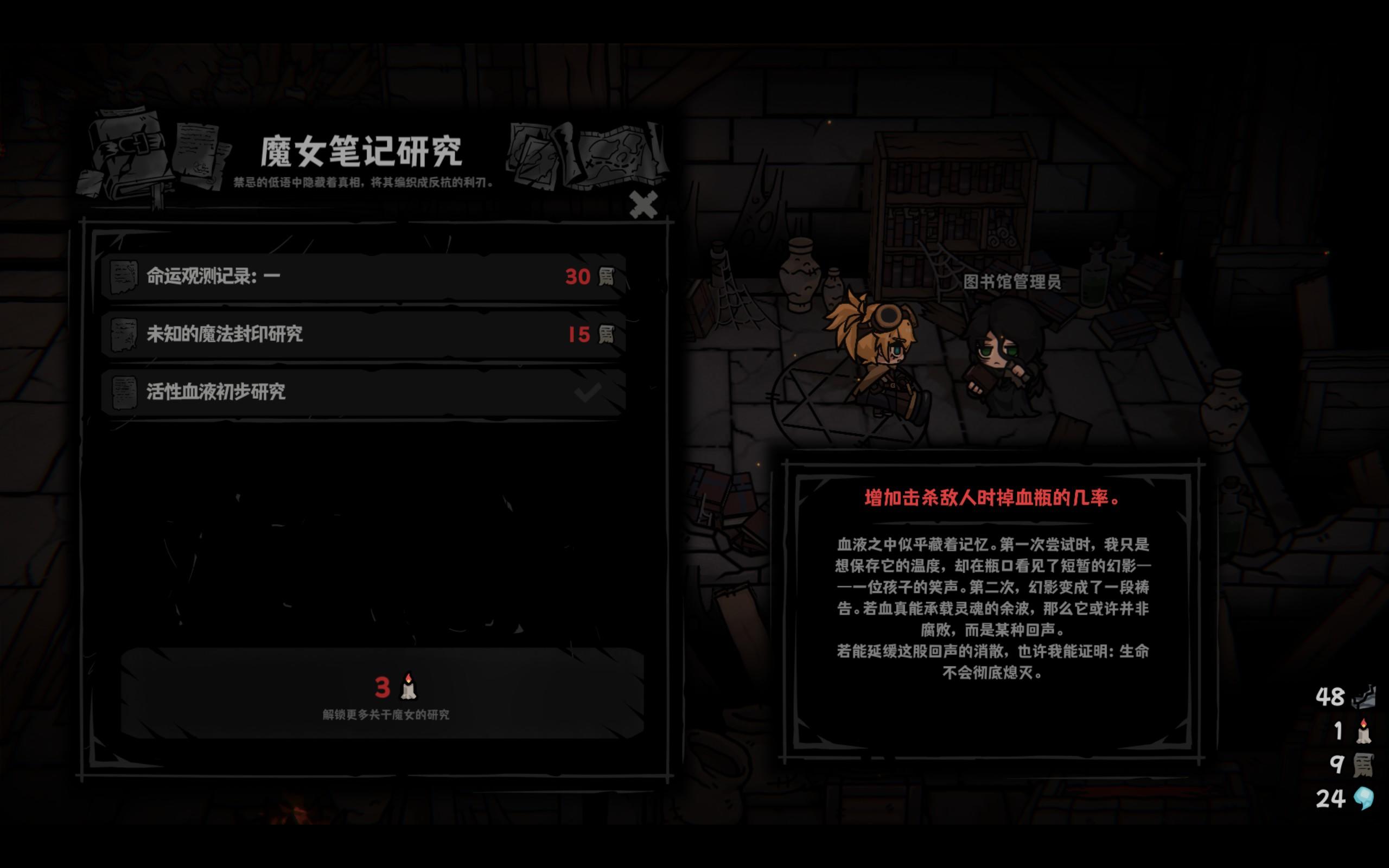 图书管理员这边需要蜡烛解锁,然后书页去解读研究,能够解锁不少局内强化,比如说更多刷新次数等等,这个局外的强化还是非常有必要的。