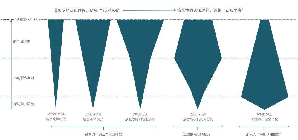 至此,我们可以认为,在青少年时代直接从智能手机、Ai搜索引擎甚至是未来的脑机接口起步,进行认知积累的下一代人类,他们无限接近一套“(正)梯形认知模型”,·如下图: