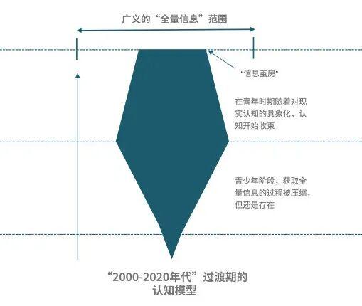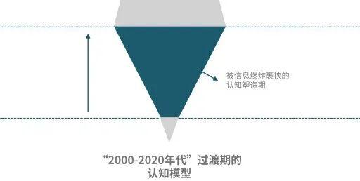 最后,用之前的“倒三角模型”与未来的“正梯形模型”融合,我们可以得到当下这一代2000-2020年代,处于认知转换期的年轻人的认知模型: