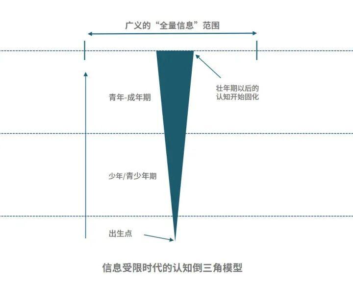 从下往上的纵轴,代表了年龄的成长,而横轴代表了人的认知广度。在古代随着年龄的增长,认知的广度单纯的随着阅历的提升而提升。“读万卷书,行万里路”就是扩充认知的唯二选择。当然,由于大部分人并不具备这两个在彼时可谓奢侈的选项,这个倒三角的顶边往往也是较为狭窄的。