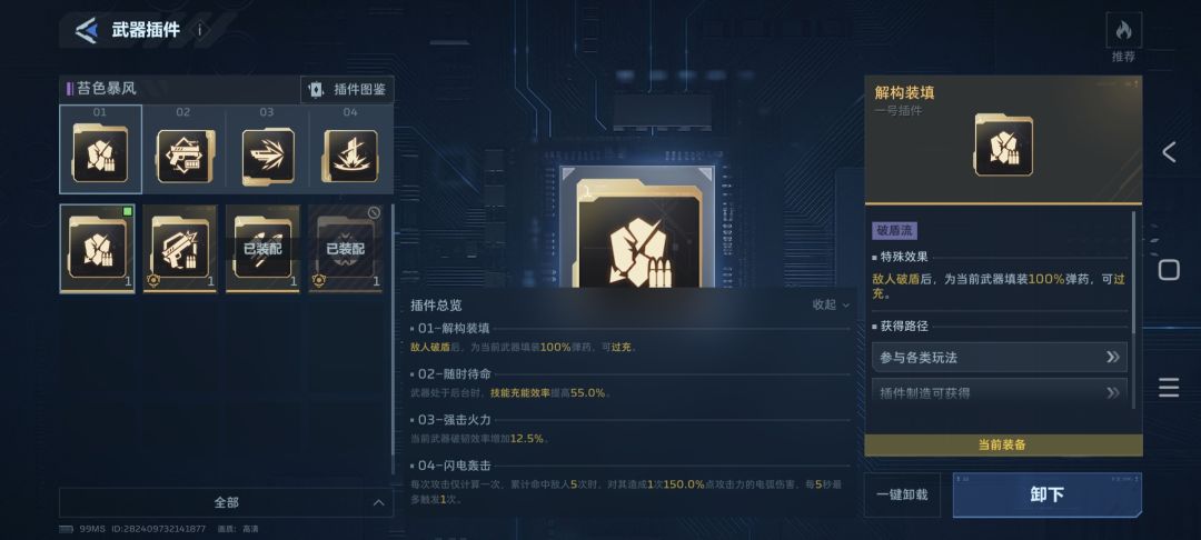 副武器:选择苔色暴风,被动10%概率可以回复一颗弹药,而主动能回复50%的弹药,插件方面2号插件随时待命是必须的,这样能快速恢复技能冷却