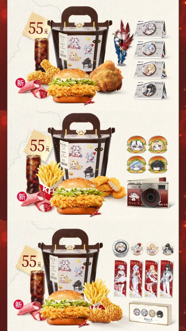 此次联动分为线上与主题店两类套餐:1月23日开放预约的「启程桶」包含角色徽章、遇水显色背卡及展示架;1月26日开放的「合拍桶」则提供磁吸卡包与亚克力冰箱贴,兼顾收藏与实用。此外,主题店专属的「晚宴桶」同步于23日开启预约,限指定门店购买,附赠收纳式冰箱贴、镭射票与透卡等线下限定周边。