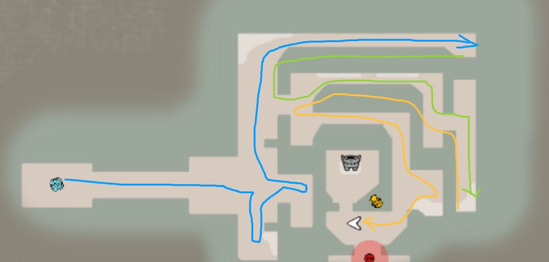 击杀小怪之后我们继续向下,要注意这里的转盘是陷阱,我们不可能避开它,建议按照蓝色箭头所示,先去把机关关闭。