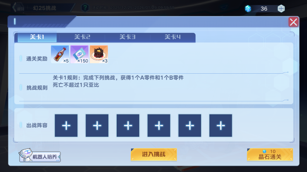 本次更新后,幻25挑战中前4个挑战开放晶石通关途径。