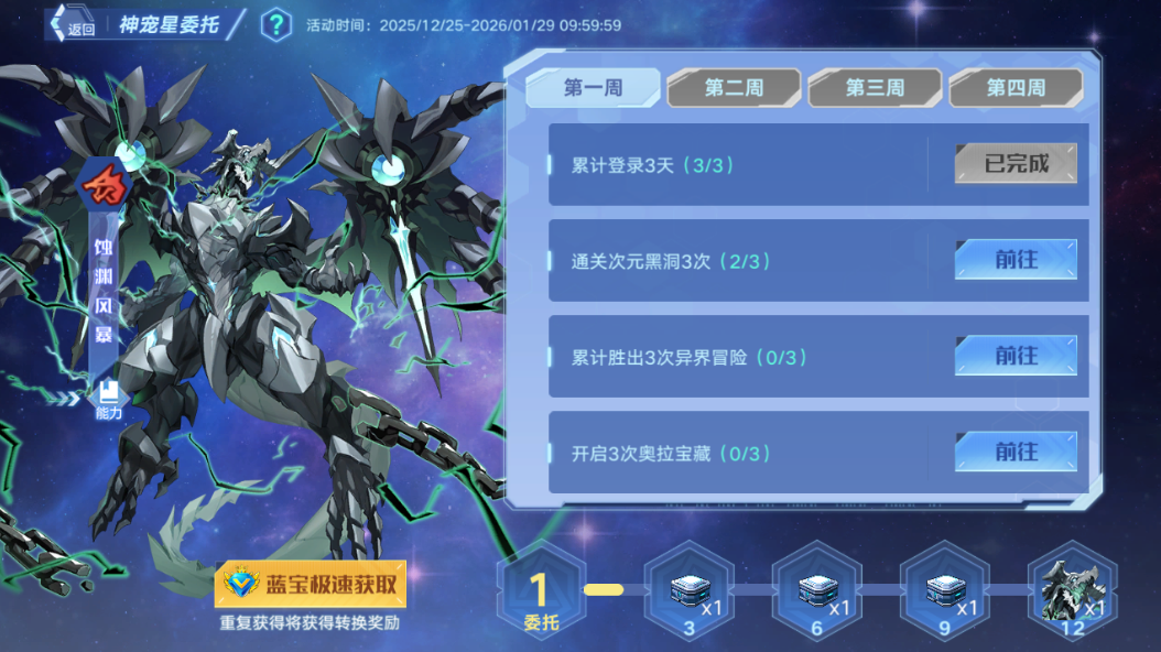 活动内容:累计完成星委托任务,获取道具奖励与风暴龙全新形态【蚀渊风暴】。蓝宝小奥拉可在蓝宝功能中直接领取形态,若小奥拉已获得该形态,重复获得将会替换为奥拉晶石*10。