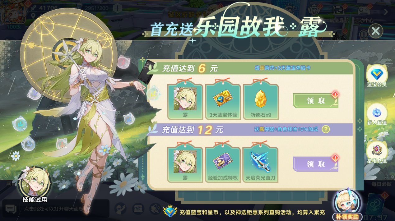 2.累计充值6元即可契约露,累计充值12元即可完成露突破,具体档位奖励如下:累计充值6元:露契约+祈愿石*9+3天蓝宝特权体验累计充值12元:露突破+装备天启荣光直刀*1+角色经验加成特权(在星际探测,次元黑洞,场景怪物战斗中获得的人物经验永久增加10%,100级前有效。100级后,特权将转化为金玉满堂*1。)