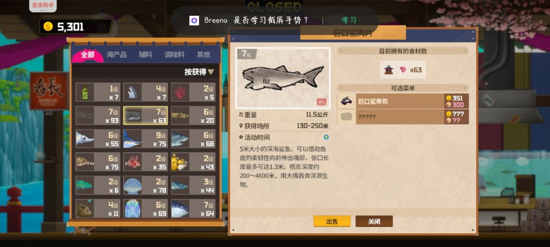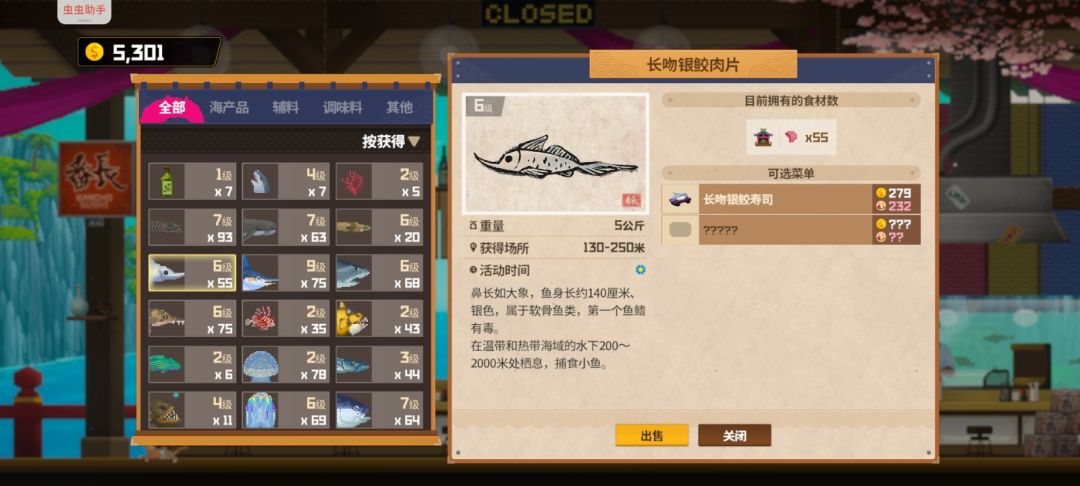 餐厅主要卖这几种鱼平均一天最少赚3000多,其他鲨鱼碰到的话就捕没碰到不用刻意去找,三齿鲨只要头