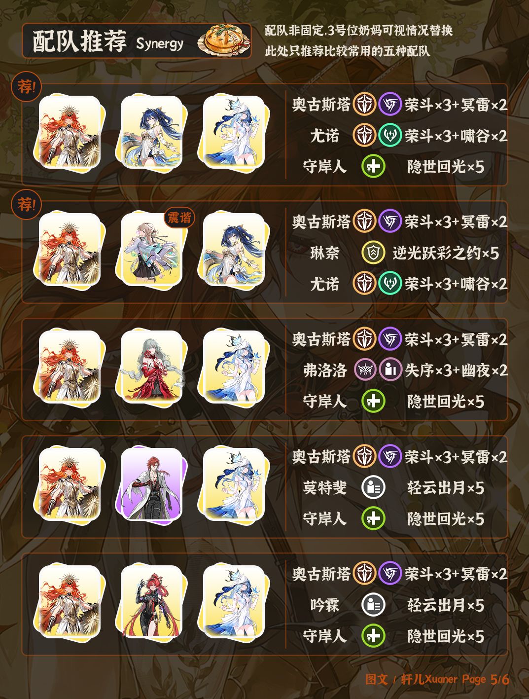 ⑤ 奥古斯塔吃重击伤害加成,最优副C为尤诺,机制完全为奥古斯塔定制。日月配队的三号位可以选择守岸人/琳奈/1链莫宁,如果没有这三个再考虑0链莫宁/维里奈等其它奶妈。其余副C可考虑莫特斐/弗洛洛加重击,吟霖加导电伤害。这些搭配伤害会稍微低一些。没有或不想用也可走双C路线。