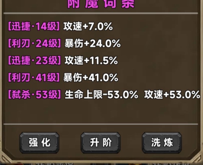 T1级别:弑杀(减生命,加攻速)、迅捷(单攻速)、凝神(增暴击、增攻速,加的攻速与同等级迅捷词条一样)、不屈(单加生命上限)、利刃(单爆伤)、暗影(加暴击,加爆伤,加的爆伤与同级别利刃相同)