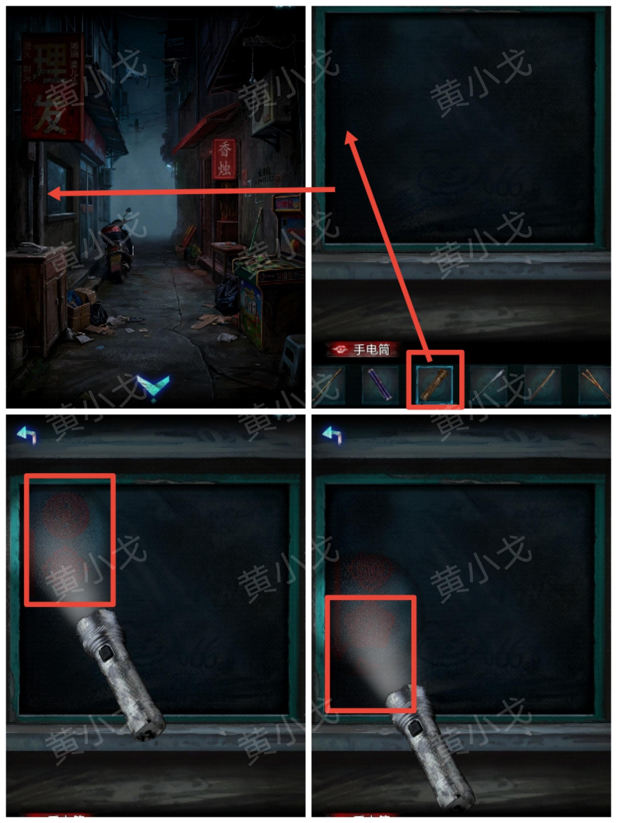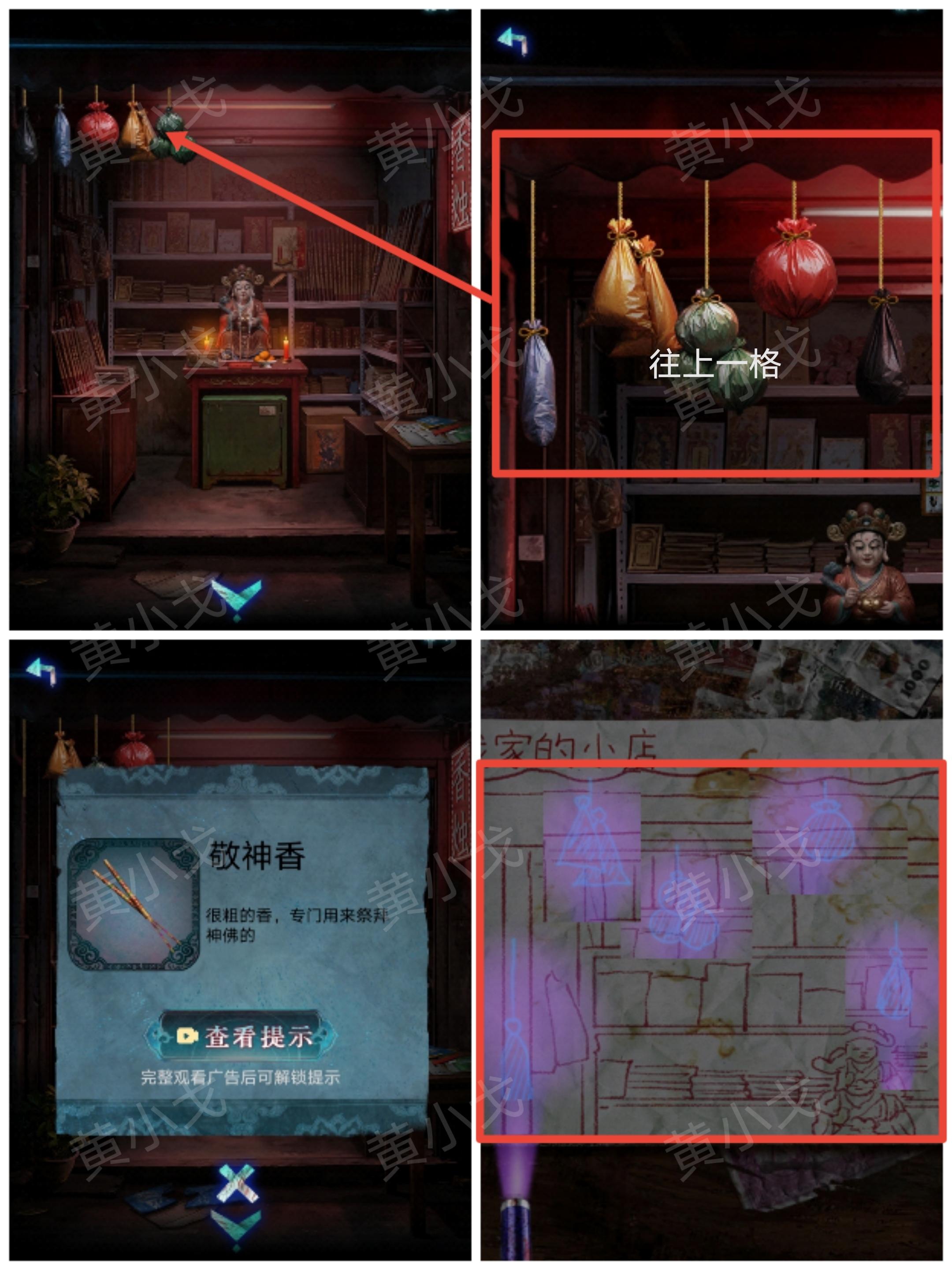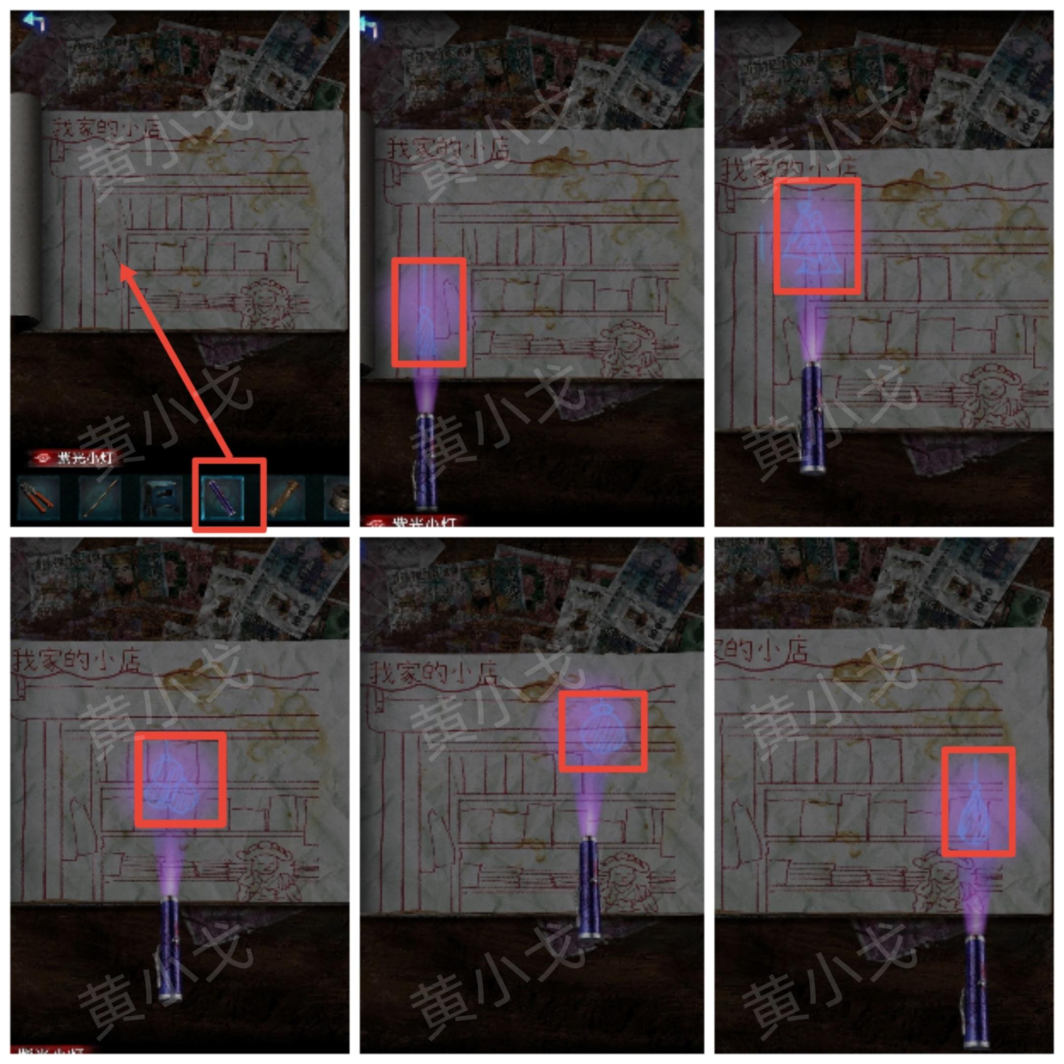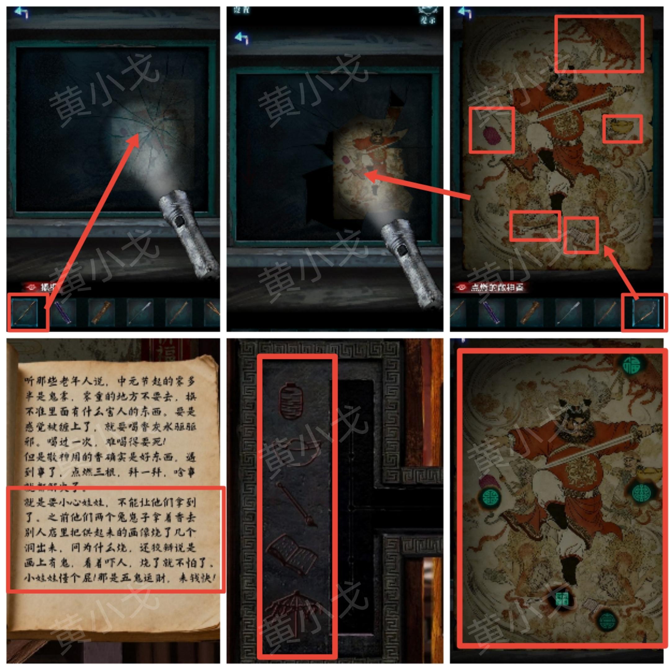 23.将光源移动到右边(有突脸小高能),看到挂画,用【撬棍】敲碎玻璃;根据香烛店架子上的册子和祠堂门上的机关图案线索,用【点燃的敬神香】烧画像上的“伞、元宝、灯笼、毛笔、书”五个位置,获得图案线索