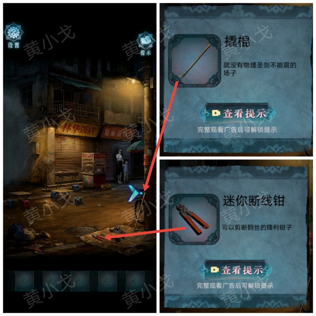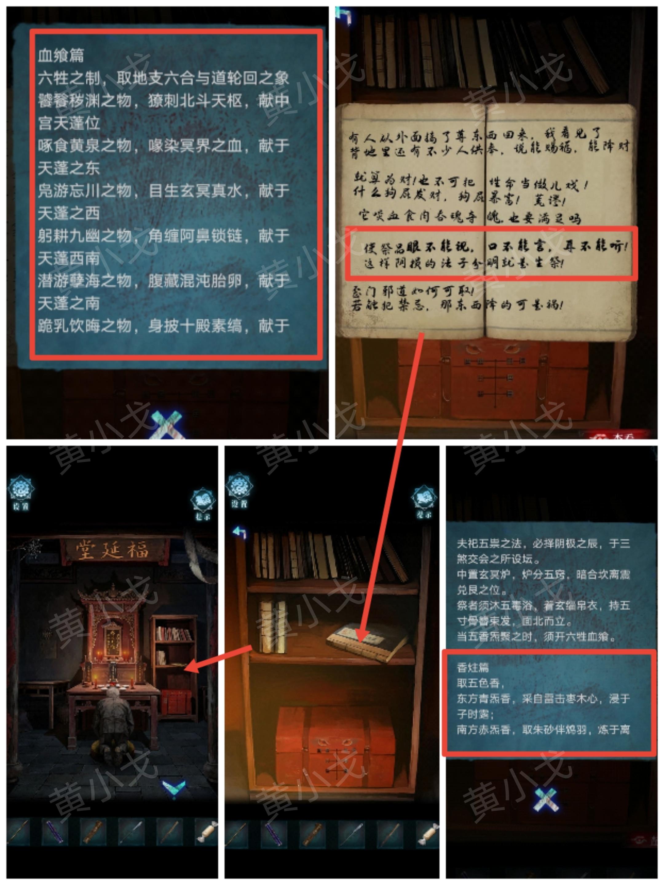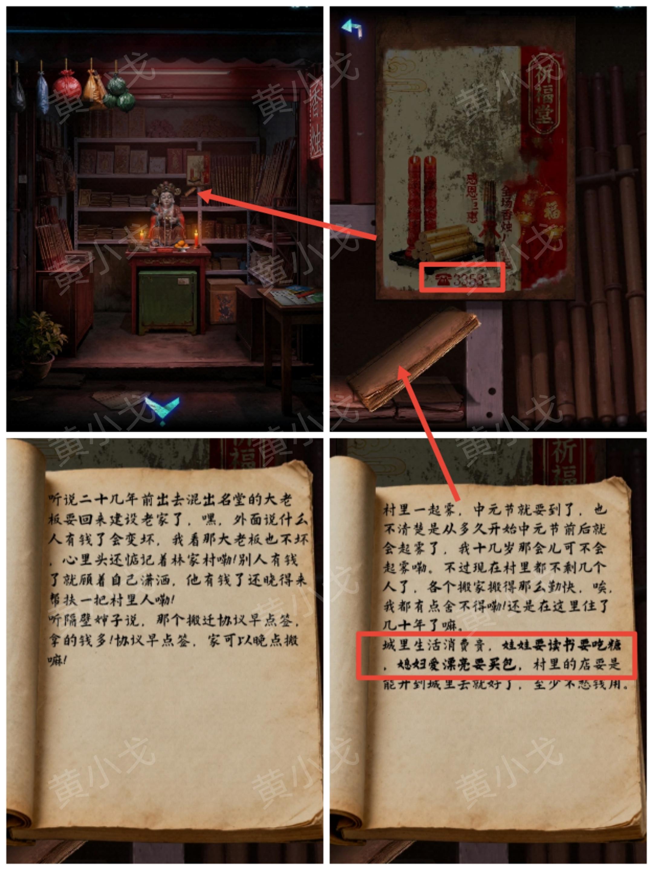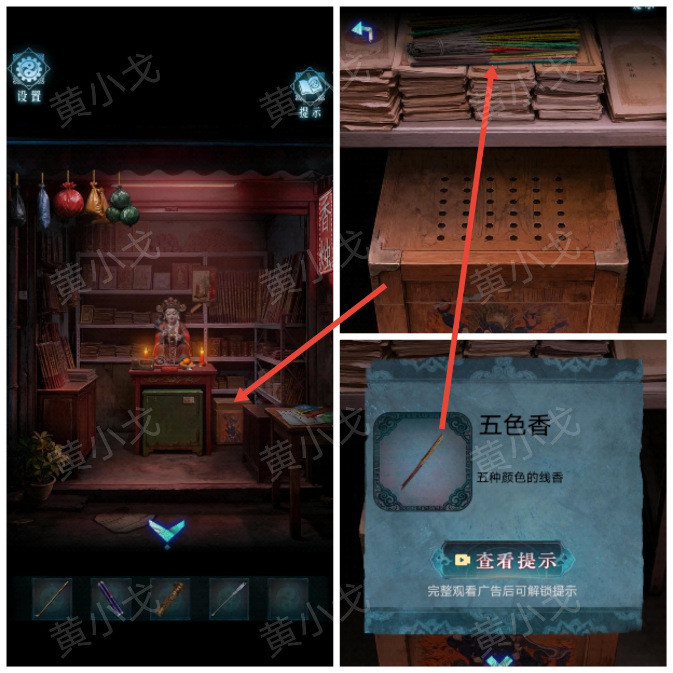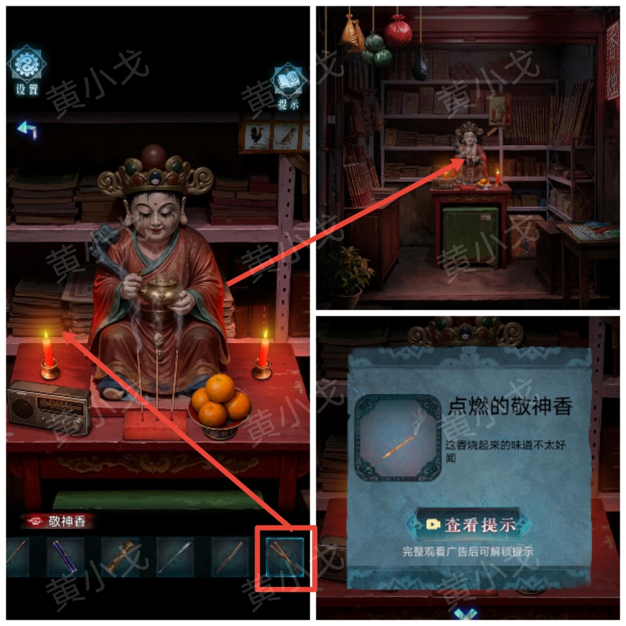 23.将光源移动到右边(有突脸小高能),看到挂画,用【撬棍】敲碎玻璃;根据香烛店架子上的册子和祠堂门上的机关图案线索,用【点燃的敬神香】烧画像上的“伞、元宝、灯笼、毛笔、书”五个位置,获得图案线索