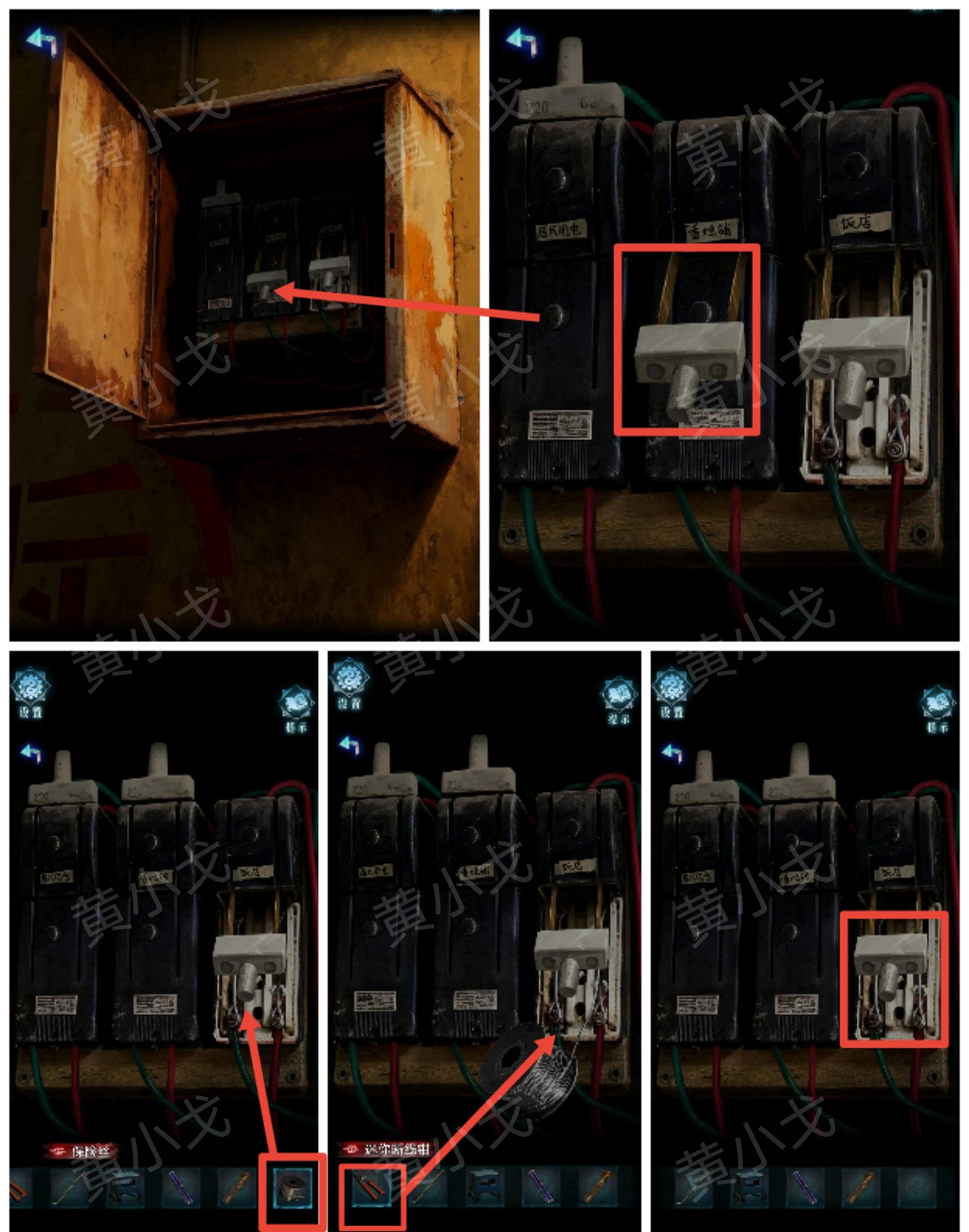 8.打开电箱,打开香烛铺的电源;给饭店闸刀装上【保险丝】,用【迷你断线钳】剪断,再打开饭店电源