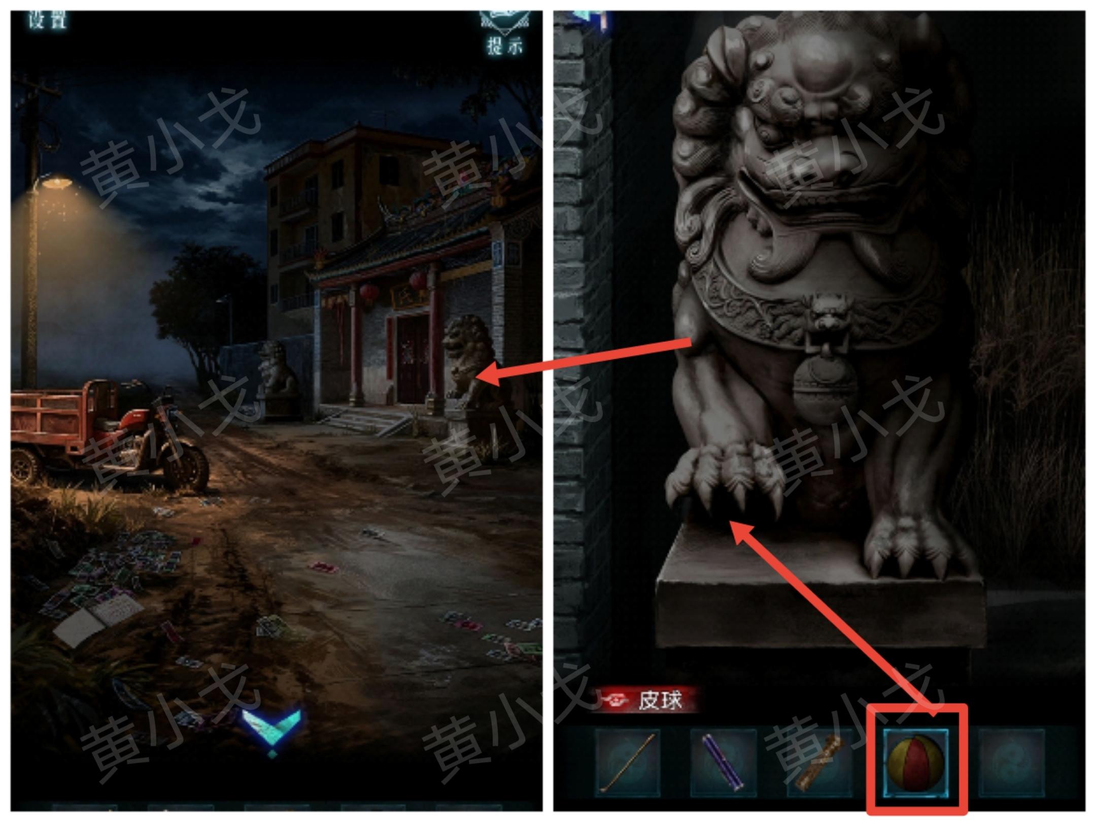 27.点击祠堂门口右侧石狮子,把【皮球】塞到石狮子脚下