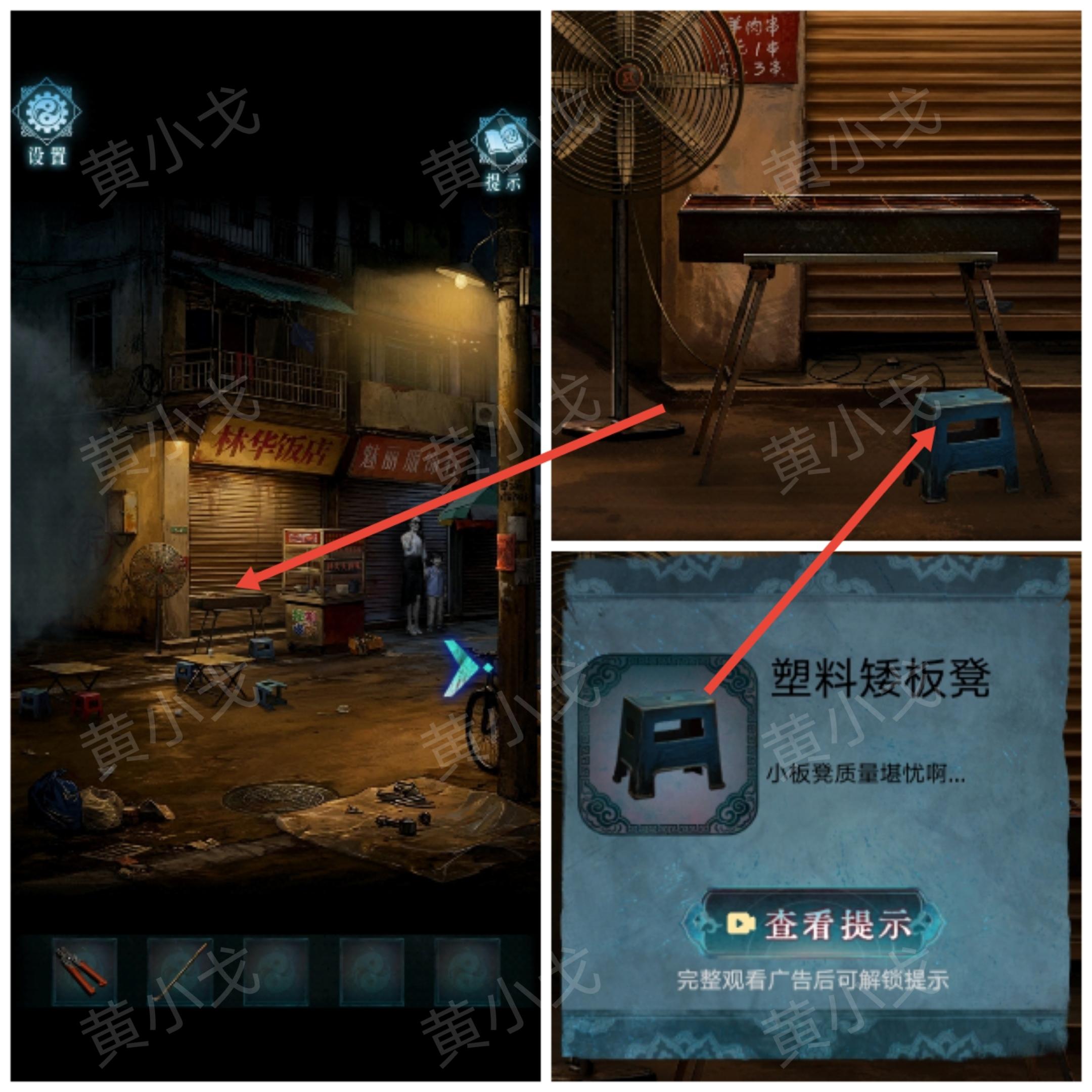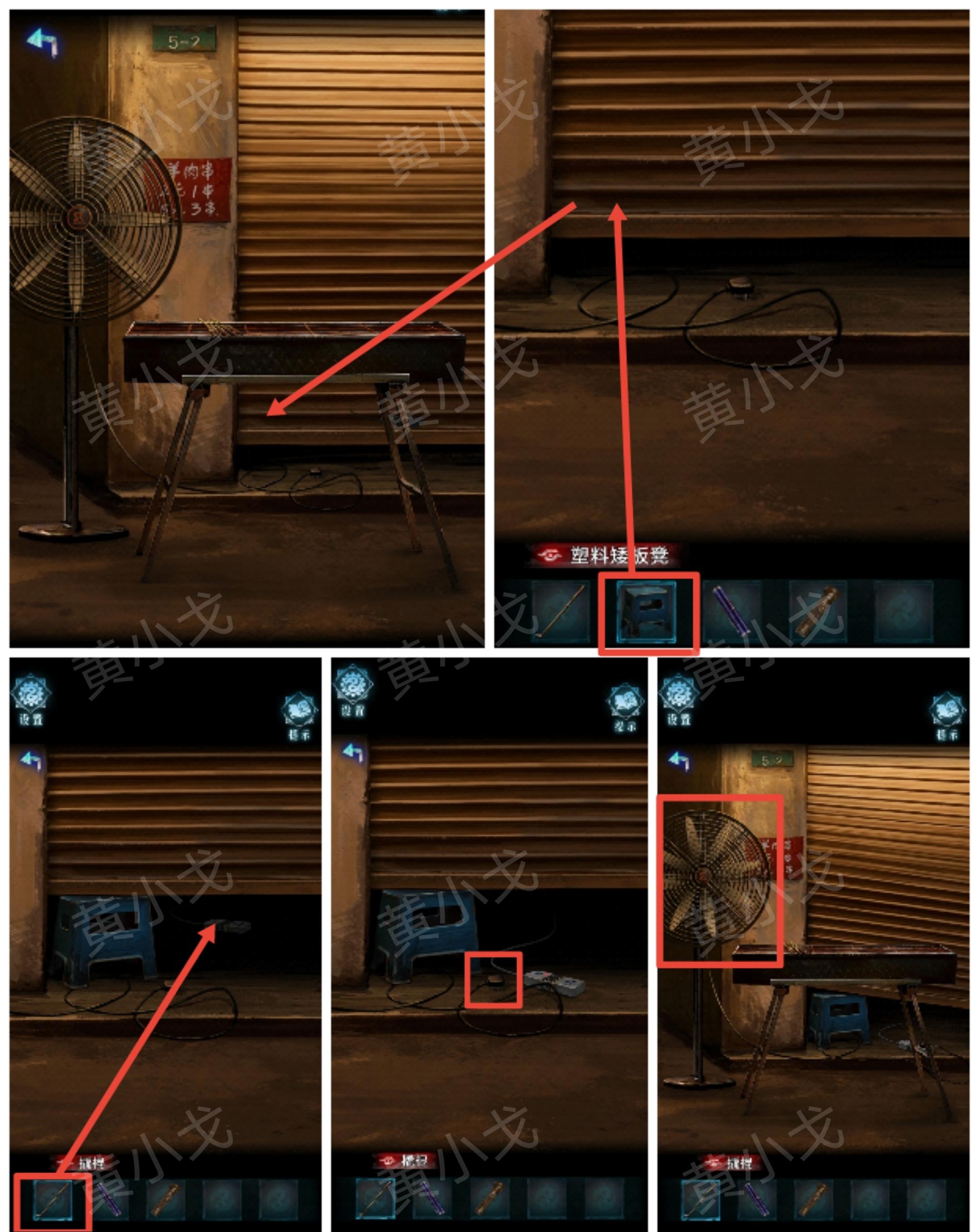 10.用【塑料矮板凳】将卷帘门撑起来,再用【撬棍】将插板拉出来,插上电源,转动风扇吹散左侧巷子的雾气