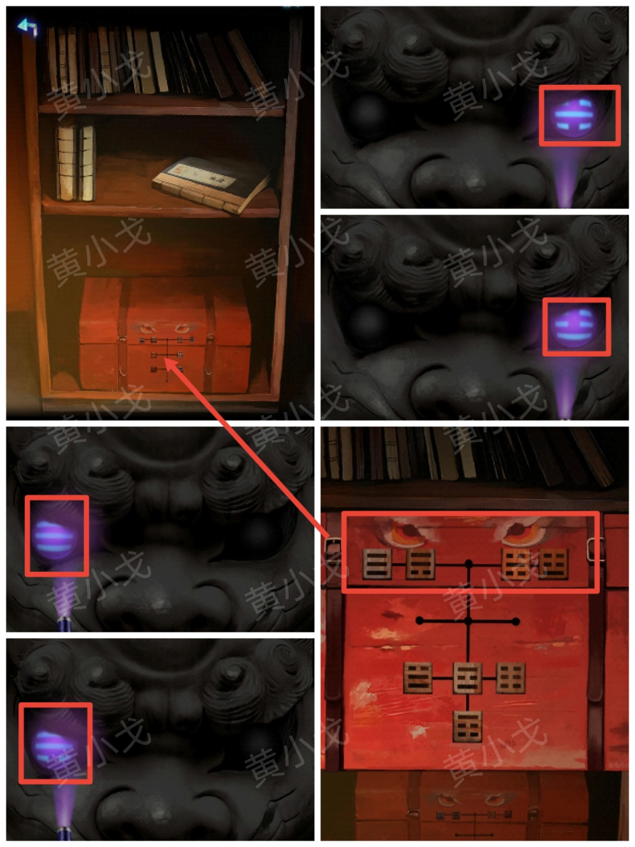 32.点击架子上的红色箱子上的机关,根据祠堂门口石狮子眼中的八卦图案线索,调整机关上对应滑块的位置