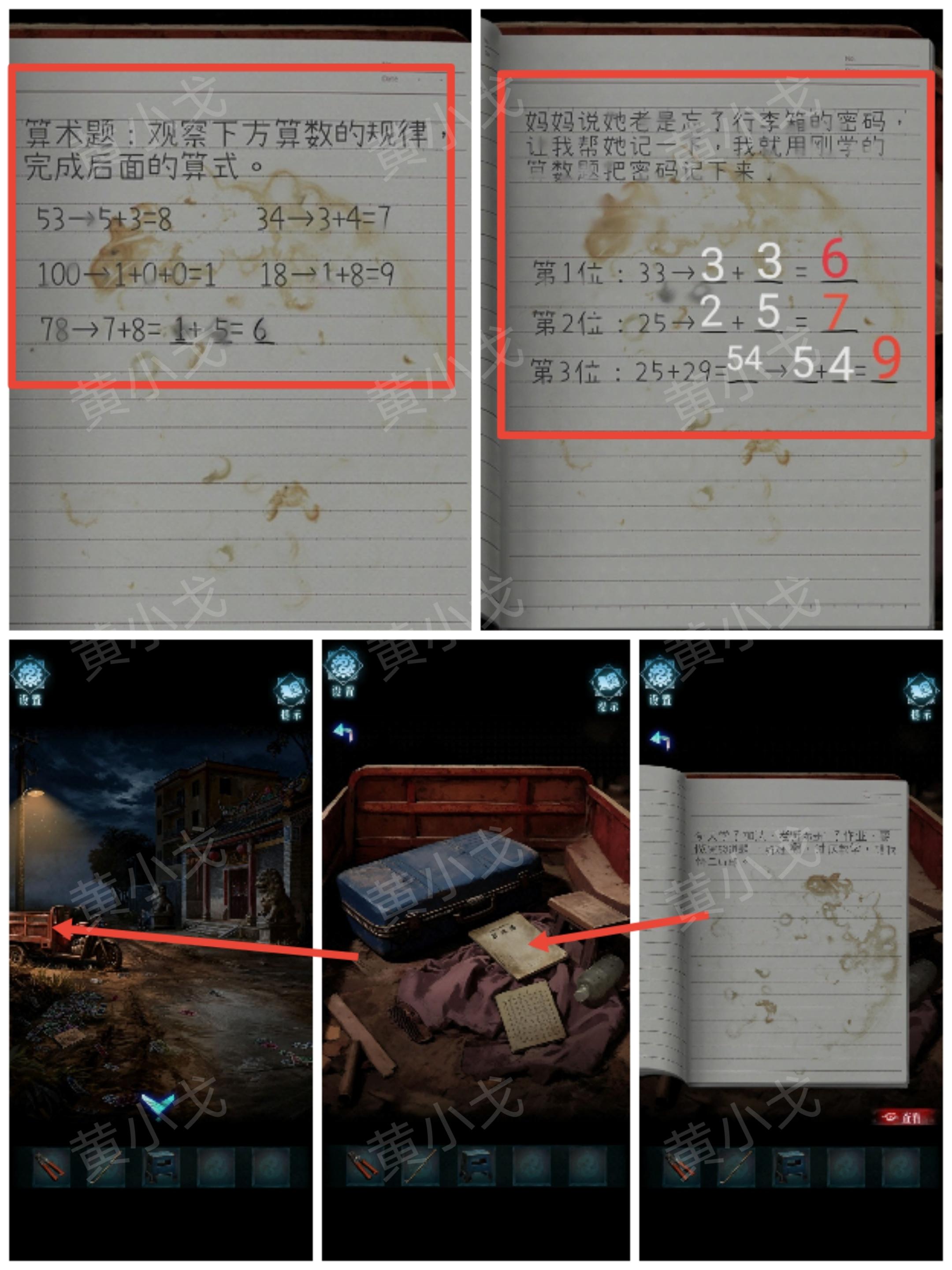 3.点击三轮车,查看算数簿,解出行李箱的密码