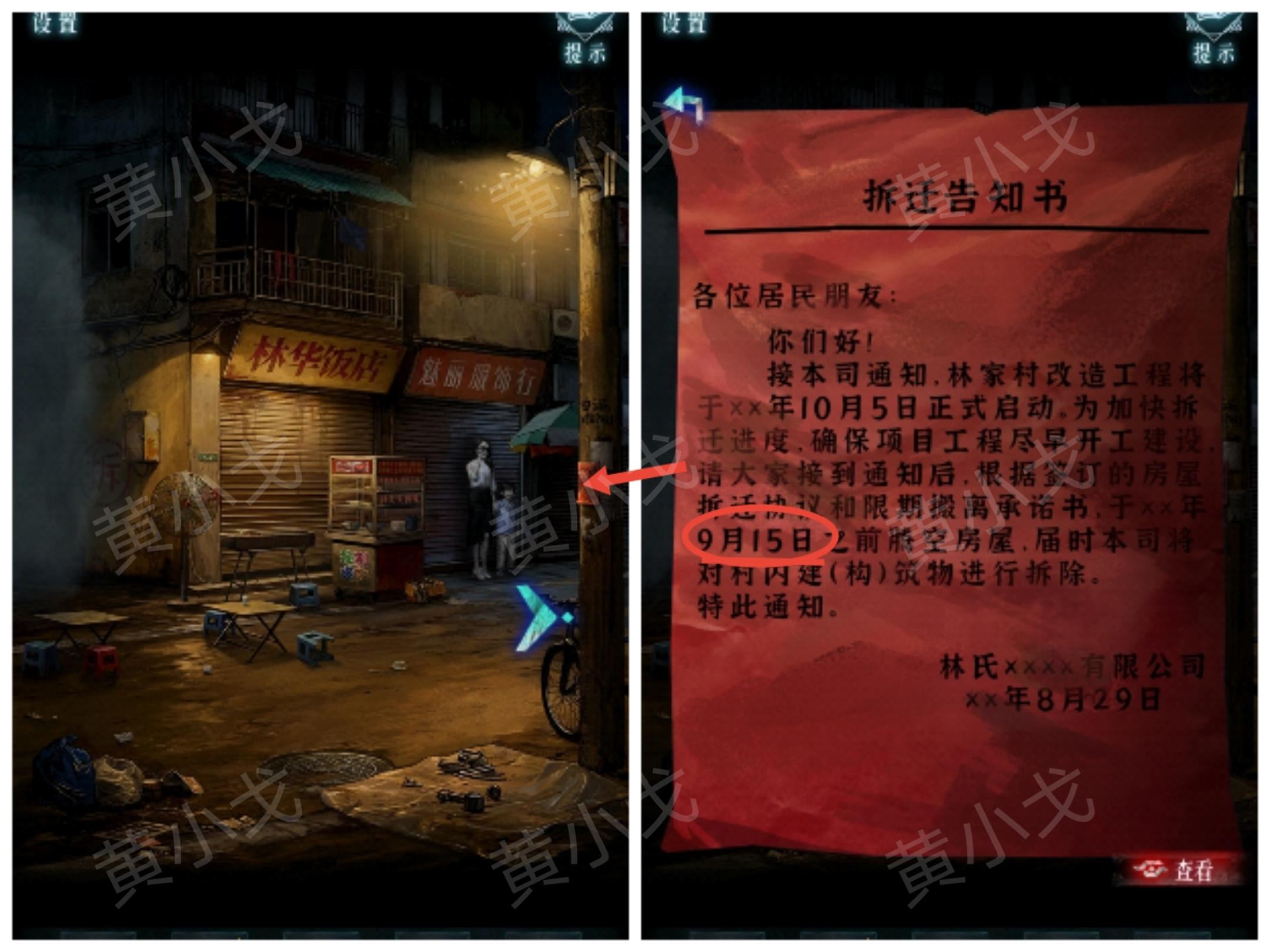 2.查看贴在电线杆上的拆迁告知书,获得线索