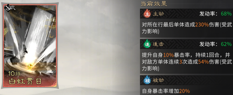 孙尚香因武力、魅力双修,技能选择灵活,但被动必带【白虹贯日】。她作为爆发武将,该技能提供的暴击率是其伤害质变的关键。