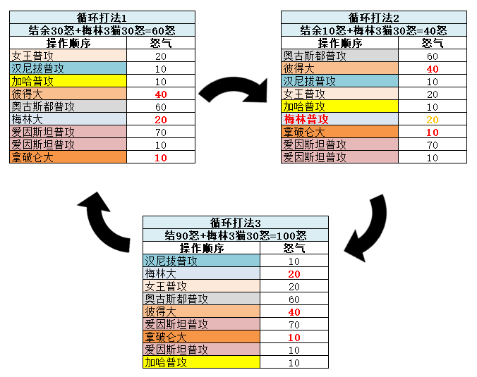 打法不固定,根据个人练度(回怒武器等)可对阵容和打法进行适当调整,如女王携带【热动力剑】,爱因斯坦4星携带【特斯拉柱】都可以提升怒气获取量,拿破仑连击也会多10点怒气
