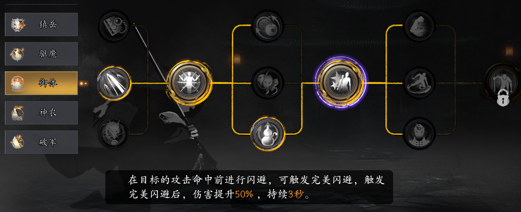 天赋推荐优先级:镇岳第一个天赋>御体第三个天赋>驱魔点满>>御体点出闪避增伤