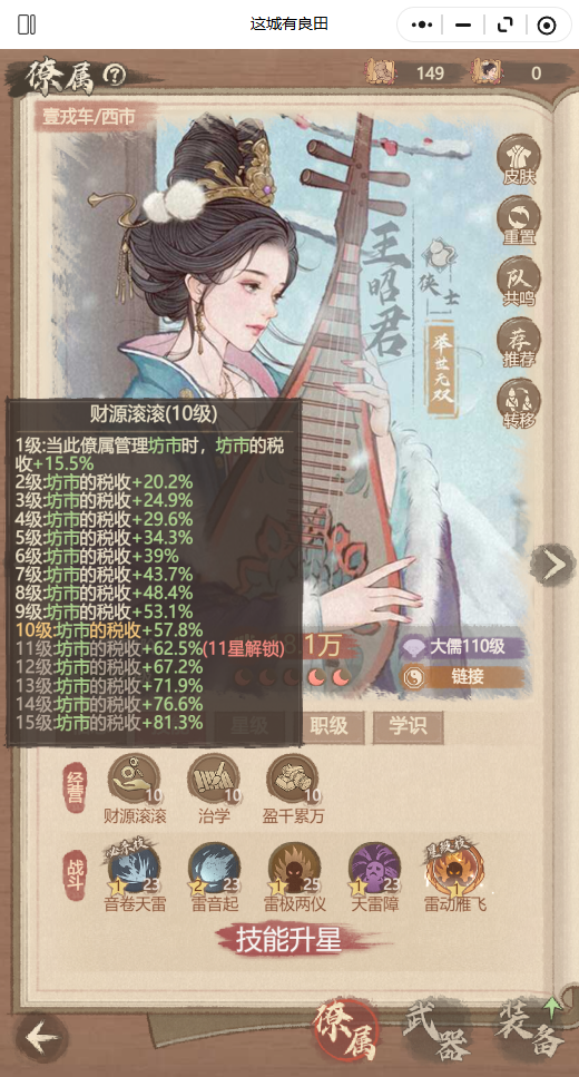 僚属经营技能的百分比加成受星级影响,技能等级根据英雄的稀有度从低到高依次分为举世-稀有-绝代,技能也是从低到高分别为生财有道-财源滚滚-日进斗金