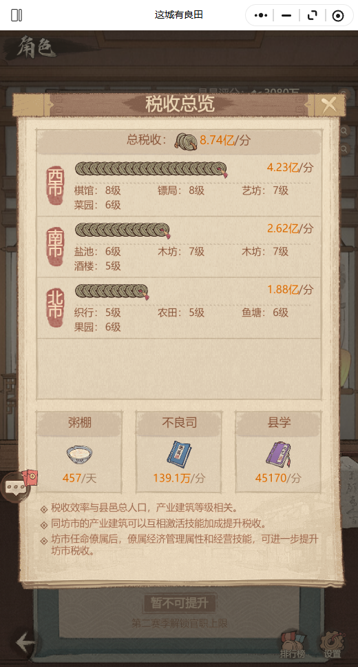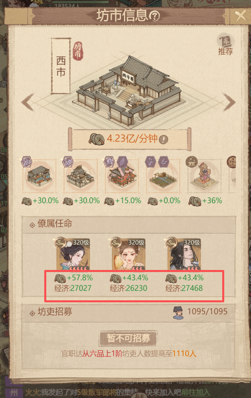 坊市任命的僚属,除其经营技能的百分比加成外,经济属性也是队坊市税收产生影响的,并不一定百分比越高,加成就越高。
