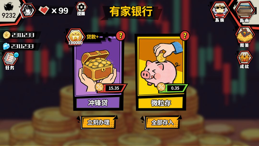玩家走入银行一看,竟然有作者大大为了避免挑战者因为太非,跌入斩杀线而提供的“冲锋贷”大礼包!只要办理立得1000金!又能去10连抽卡再搏一轮了!至于借贷之后会怎么样?我都要被斩杀了,根本不在乎!就算在还款前每次战斗扣除20%奖金作为利息,也比我立马被斩杀强!