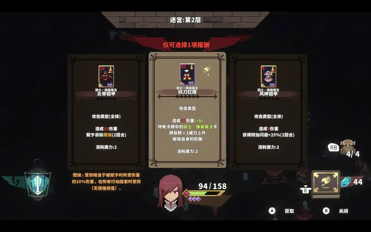 在核心的战斗玩法上,在形式上我总感觉它是为手柄玩家或者主机玩家而设计的(查到的是有NS版)。具体来说你单回合最多只能出4张牌,对应手柄右侧的XYAB。4张牌是由你的卡池中随机抽取的,虽然你也有1次换牌的机会,但是会消耗最大生命的5%且不一定能换到你中意的牌。不同的牌还会消耗相应的能量点,一般来说你单局最多出3张牌,除非你有一些提供能量上限的道具。获得相同的卡牌后可以升级提升数值,在休息点还可以进行多个维度的强化,如减少卡费或者增强威力、概率等等。