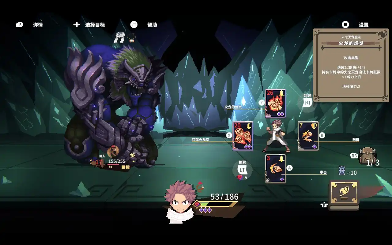 我首次通关用的是主角纳兹(擅长高攻火系魔法)、露西(可以针对敌方的招式意图有针对性地破解)以及格雷(T定位,大量的高防御和减益卡牌,且能转换防御为攻击)。