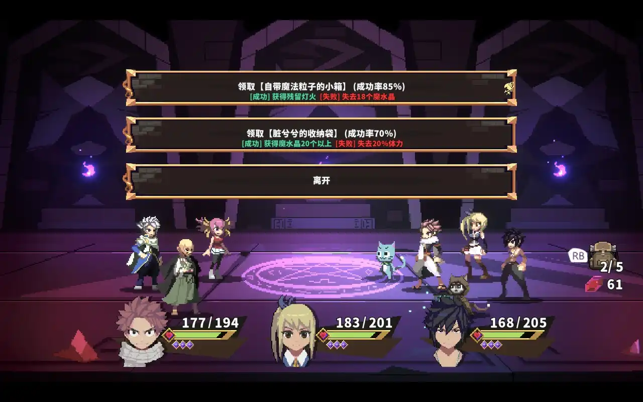 不过除了角色、设定和招式外,轻剧情的本作可以说与原作毫无关联,给我感觉更像是个同人作品。也正是因为重玩法轻剧情,即便完全没有接触妖尾IP的人也可以尽情畅玩。故事背景大致就是魔导士公会妖精的尾巴的地下出现了神秘的门,主角团需要闯过这些由大地之造型魔法建造的迷宫,找到来自最深处的秘密。游戏的文本量非常之少,但是在休息点也会有一些很有意思的对话。比如说在选择格雷游玩的时候,拉比会问他为啥要做果男?格雷答“之前修行时落下的坏习惯,不自觉的就想脱衣服”,还是有点小幽默的。