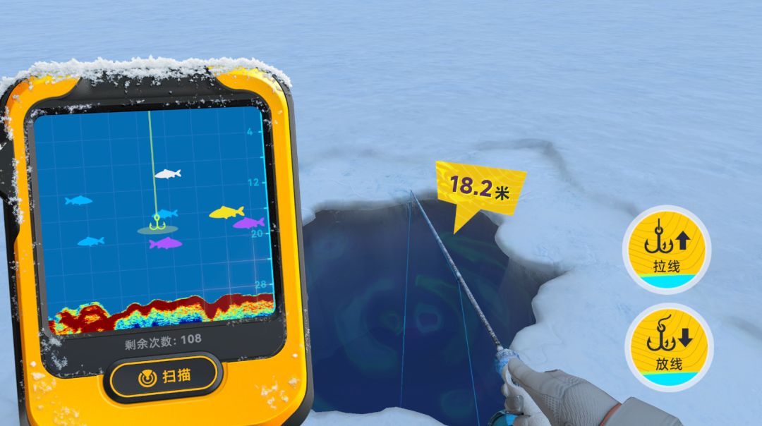 冰钓的玩法很有意思,最主要是放线诱鱼咬钩的过程,要用探鱼器看出水下鱼品质的分层,根据自己的目标调整鱼饵位置,来定向地钓到对应品质的鱼。注意:鱼咬钩后还有一个刺鱼的变化,会有冰冻效应,刺鱼的关键位置会滑动非常快,需要眼疾手快。刺鱼之后就是常规遛鱼过程啦~
