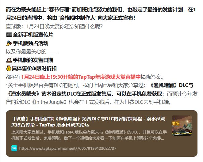 今天带来一条制作人的全中文视频。上次提到,制作人受邀出席1月24日TapTap年度游戏直播的现场,不仅将作为颁奖嘉宾,与大家共同见证年度游戏的诞生,也会在直播中,与大家分享《潜水员戴夫》手机版的具体计划: