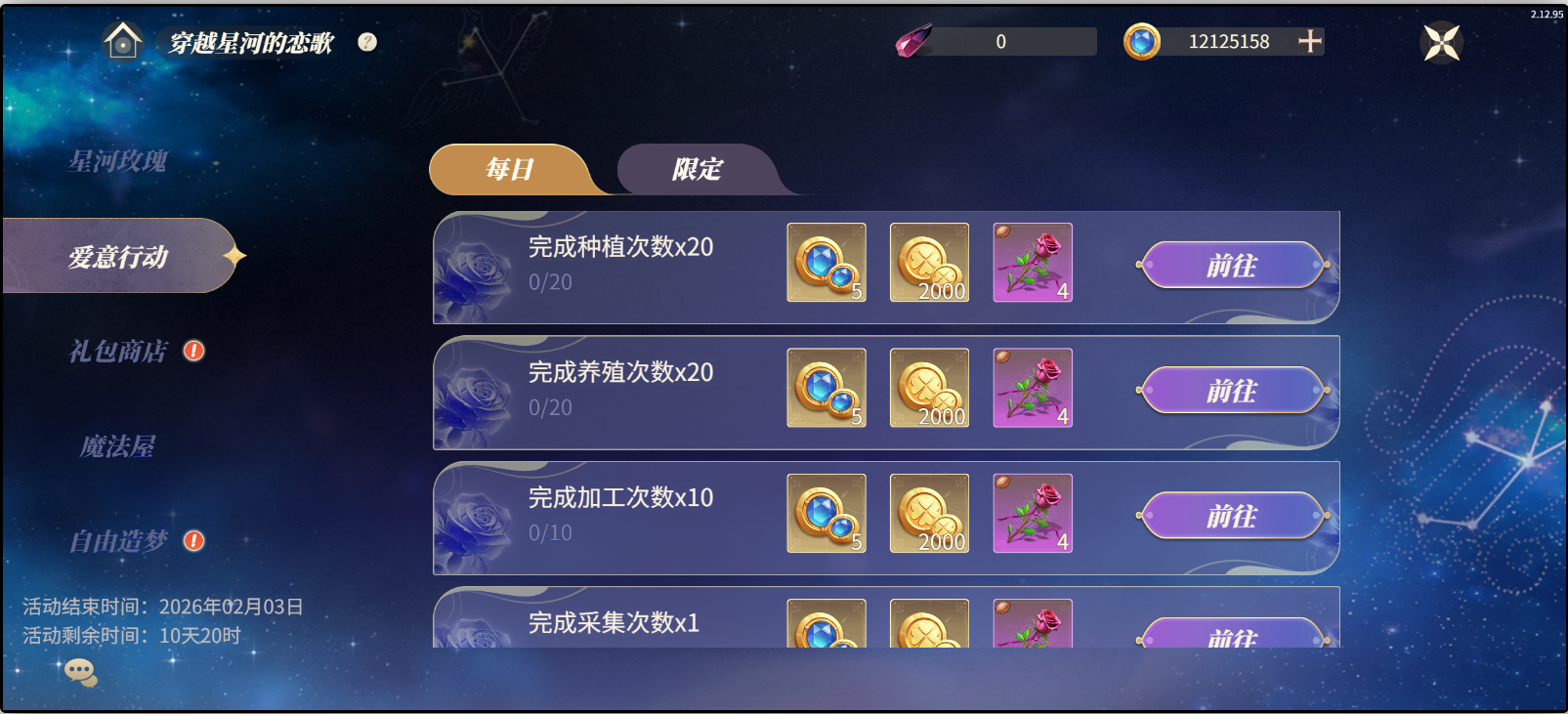 分为每日和限定任务,完成对应任务可获取到钻石,金币,星河玫瑰种子。