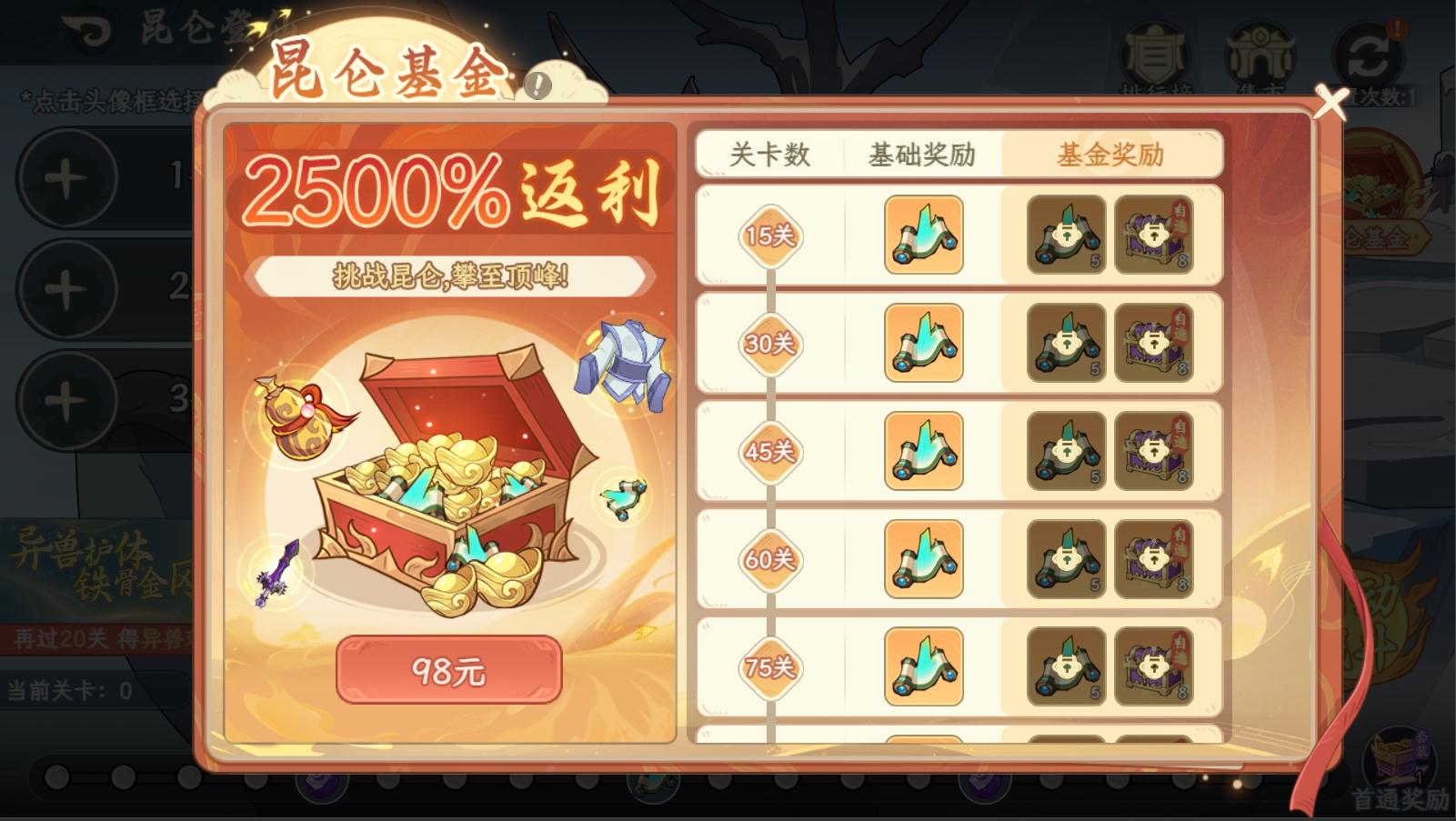 【活动描述】挑战昆仑达到指定关卡后,可通过昆仑基金领取丰厚奖励。