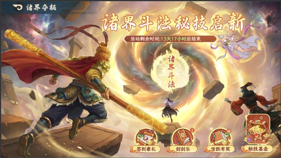 【活动描述】诸界夺秘活动包含诸界斗法、签到好礼,刮刮乐、活跃有奖、秘技基金在内的活动合集。