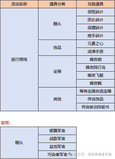 1、后续兑换内容将返场往期活动随从、饰品、坐骑或背饰等,以后续每月实际旅行商栈预告为准;
