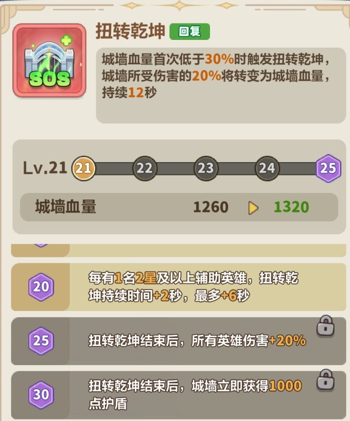 • 城墙血量每减少25%,自动生成1000点护盾,持续20秒,整局可触发3次;