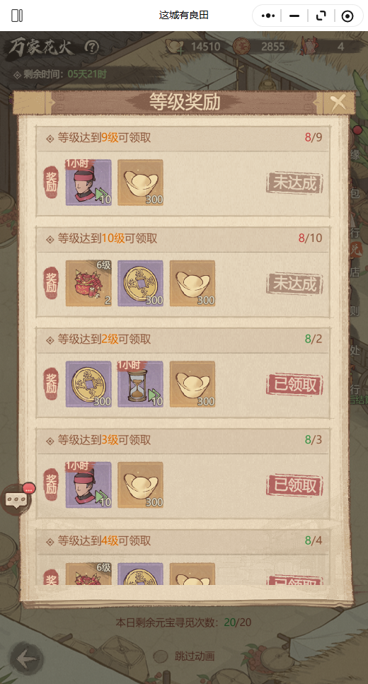花火等级提升后会有对应的奖励,奖励中也有合成材料,记得及时领取