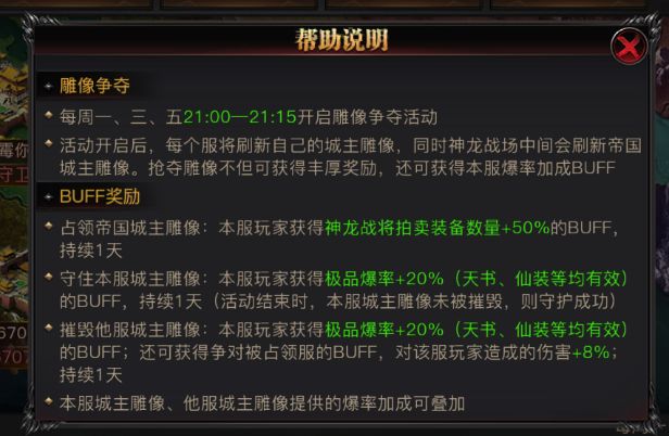 若同时达成占领中央帝国雕像攻占其他三服雕像守住本服雕像,将会达成全服极品装备爆率直达80%,⏳ 史诗级增益持续 24小时!