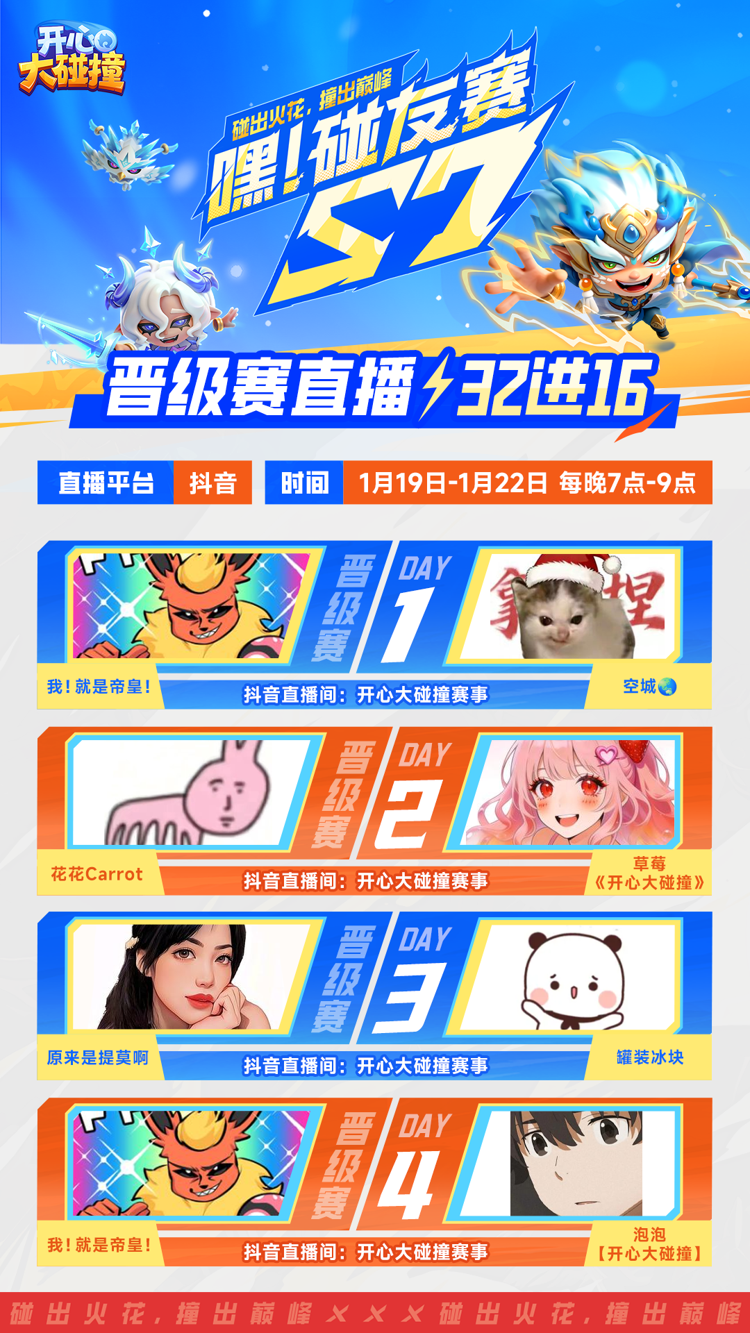 1月19日-1月22日,每晚19点-21点抖音搜索:【开心大碰撞赛事】