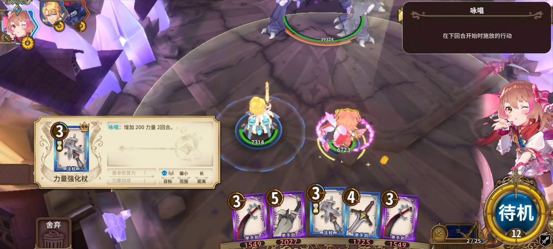 站桩输出向的关卡,在桃丽丝的武器中可以编入两三根力量强化类法杖,如果开局能抽到会比较有效,不过也可能会卡手或打乱架势剑顺序。法师的加力量武器是群体受益的,需要吟唱。