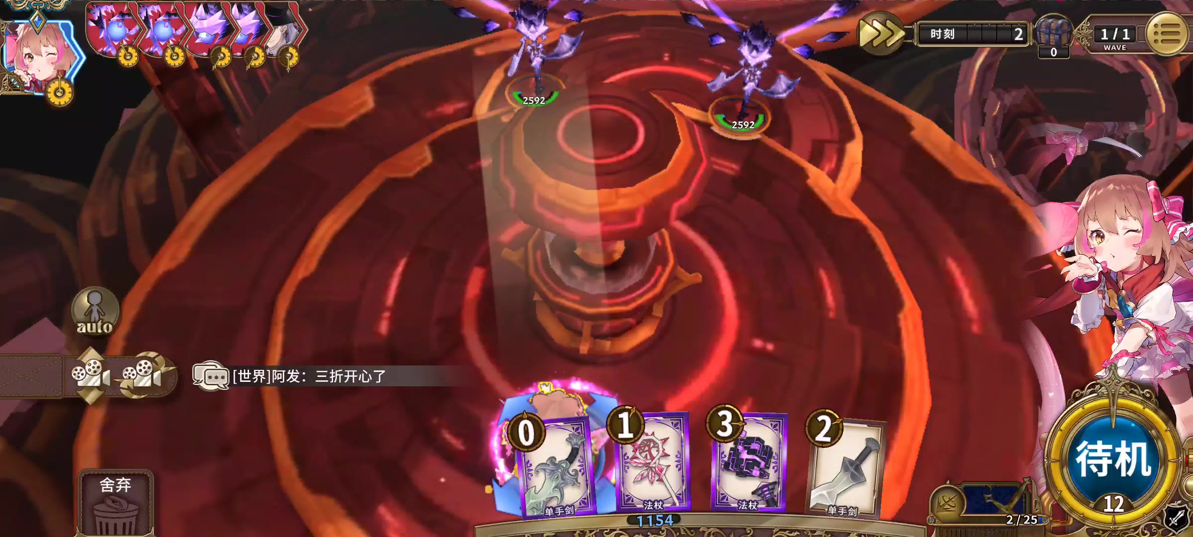 站桩输出向的关卡,在桃丽丝的武器中可以编入两三根力量强化类法杖,如果开局能抽到会比较有效,不过也可能会卡手或打乱架势剑顺序。法师的加力量武器是群体受益的,需要吟唱。