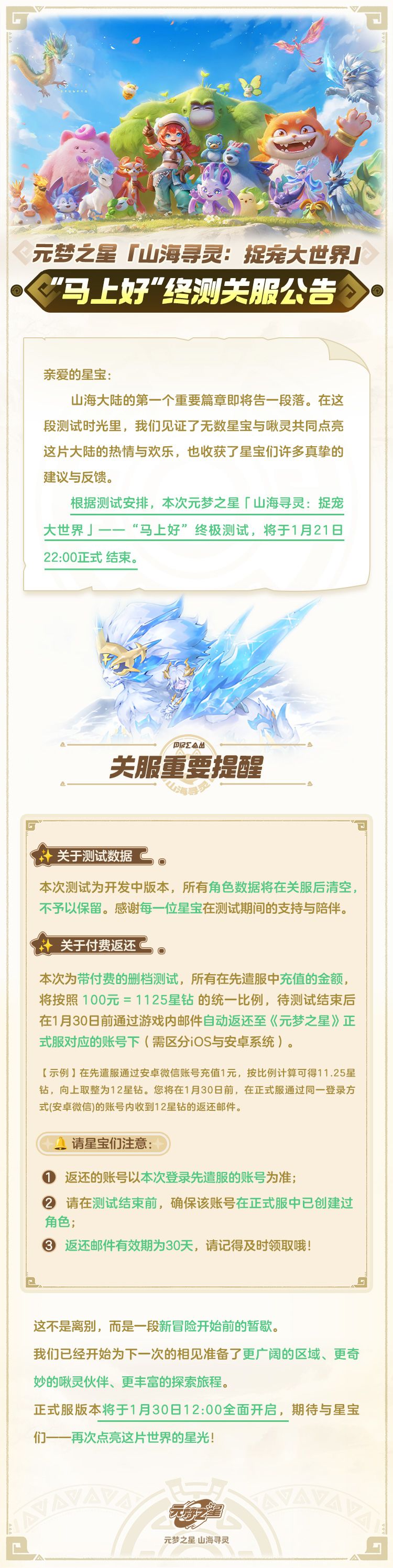 元梦之星「山海寻灵:捉宠大世界」“马上好”测试将于2026年1月21日22:00正式结束,很幸运能与星宝们相遇,我们也见证了无数星宝与啾灵们共同点亮的热情与欢乐