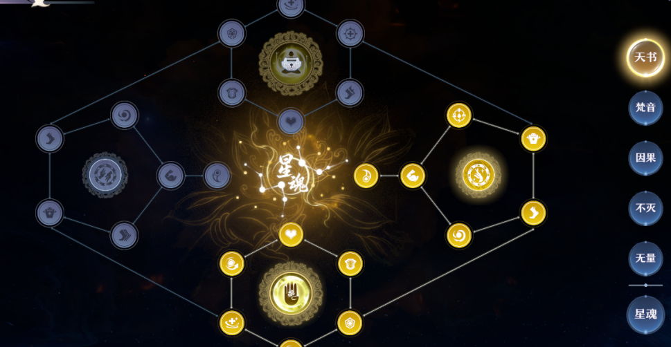星魂优先选择右侧星魂路线。该路线增益效果精准契合【因果+无量】的技能组合定位,可进一步强化治疗量加成、技能覆盖效率与减伤buff收益,全面提升天音寺的辅助作战能力。