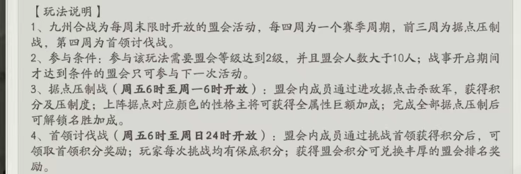 从1.3版本的首领战开始,九州合战首领战开放时间调整为周五6:00至周日24:00,首领战期间每个盟会成员拥有总计3次挑战次数,挑战次数在首领战期间不会刷新,让各位明公们有更充足的时间来挑战首领。