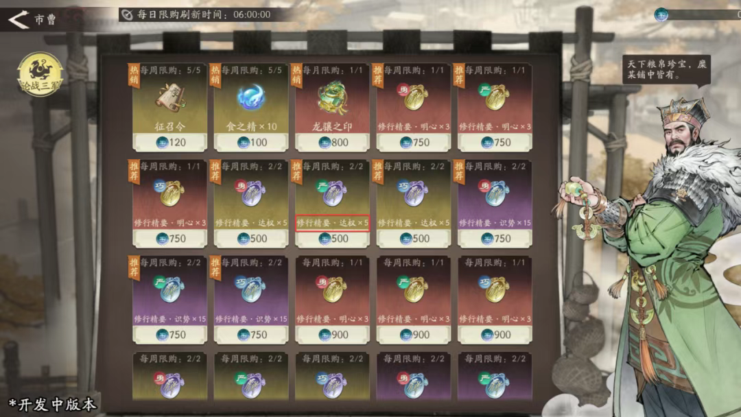 9、 将下调[论战三军]商店中副将修行材料的售出价格。本次价格调整将在1月26日(周一)06:00:00商店限购刷新时生效。价格调整后,我们将尽快给1月26日(周一)06:00:00前已经在该商店购买过副将修行材料的玩家返还消耗货币差价。
