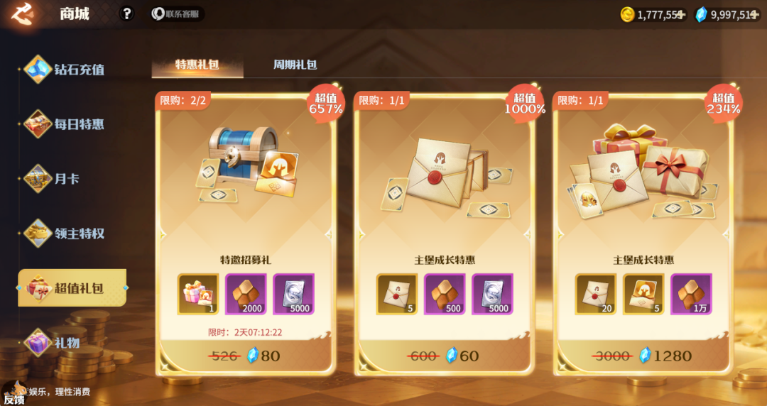活动时间:2026/1/21 00:00 ~ 2026/1/29 24:00活动等级:主堡4级开启。活动简介:活动期间领主可在商城超值礼包处购买相应的限时折扣礼包。活动奖励:特邀招募礼包、自选龙石礼。